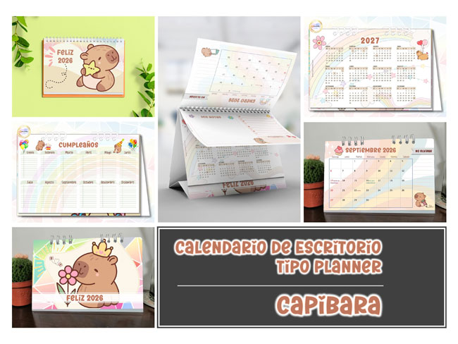 Práctico calendario de escritorio que ayudará a organizar las actividades del mes, con espacio para hacer pequeñas anotaciones cada día, y notas a un costado. Incluye: Calendario del año, Cumpleaños, Planner mensual de enero a diciembre, Calendario del año siguiente. Base de cartulina laminada, impreso en 16 páginas de papel opalina, arillo metálico. Medidas: 22cm de largo x 14.5cm de alto x 7cm ancho en la base. Costo: |