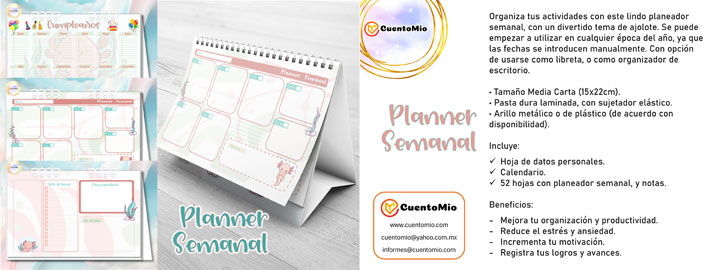 Para organizar las actividades escolares, este planeador semanal es una herramienta muy útil. Recomendado tanto para maestros, como para alumnos, ya sea de nivel Secundaria, Primaria, o Preescolar. Puede usarse como libreta, o como organizador de escritorio.